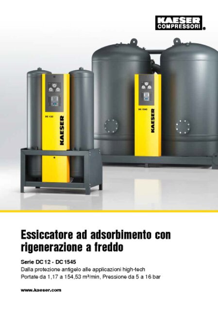 Essiccatori ad adsorbimento a rigenerazione a freddo Kaeser Serie DC Portate da 0,15 a 154,53 m³/min. Essiccatori ad adsorbimento con rigenerazione a freddo per punti di rugiada fino a -70 °C. Fornitura comprensiva di filtri installati a monte e a valle.